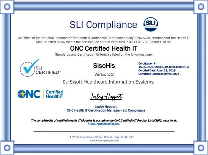SisoHBYS, ABD Sağlık ve İnsan Hizmetleri Bakanlığı - Sağlık Bilgi Teknolojisi Ulusal Koordinatör Ofisi (ONC) tarafından yetkilendirilmiş kuruluş SLI Compliance tarafından test edilmiş ve sertifikalandırılmıştır. SisoHBYS ABD Sağlık ve İnsan Hizmetleri Bakanlığı tarafından belirlenmiş Meaningful Use Akreditasyon kriterlerini sağlayan Türkiye’deki ilk HBYS yazılımı oldu.